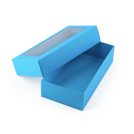 Sky blue color gift box made of decorative cardboard with a lid and window.
